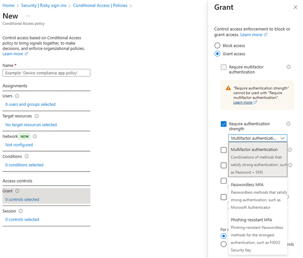 From here, you can turn on the configuration, specifically targeting your risky sign-ins. As a best practice here, Microsoft recommends targeting High and Medium sign-ins, and, as part of your future Grant controls, requiring another blast of MFA goodness, such as this: