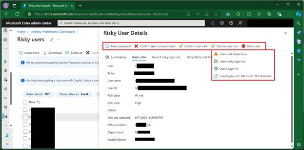 - Block User: This action blocks a user from signing in until an investigation is completed and the risk is mitigated.