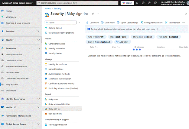 To see the Risky Users or Sign-ins in your environment, the best way is to go to your Microsoft Entra Admin Center.
