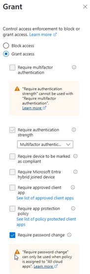 Note that, when you select “Require password change,” the option for “Require authentication strength” automatically selects. This is another part of the failsafe mechanisms to ensure that compromised users are handled in the most secure way possible. If a password reset is required, the bad actor would have to set up MS Authenticator and wouldn’t need to simply have an e-mail address or phone number compromised. It increases difficulty. The password reset utilizes Microsoft’s Self Service Password Reset functionality to accomplish.